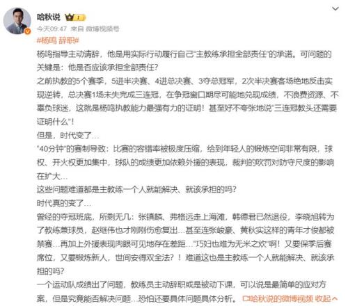 不希望杨鸣指导离职,他应该带10多年才好,他已经证明过自己的实力,有好阵容就可以夺冠。