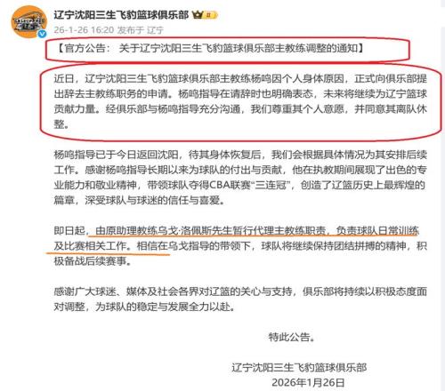 在今天下午,辽宁队正式发布了通知,对杨鸣下课之事,进行广而告之!同时,任命球队助理教练乌戈·洛佩斯担任球队主教练,带领辽宁队参加接下来的比赛。
